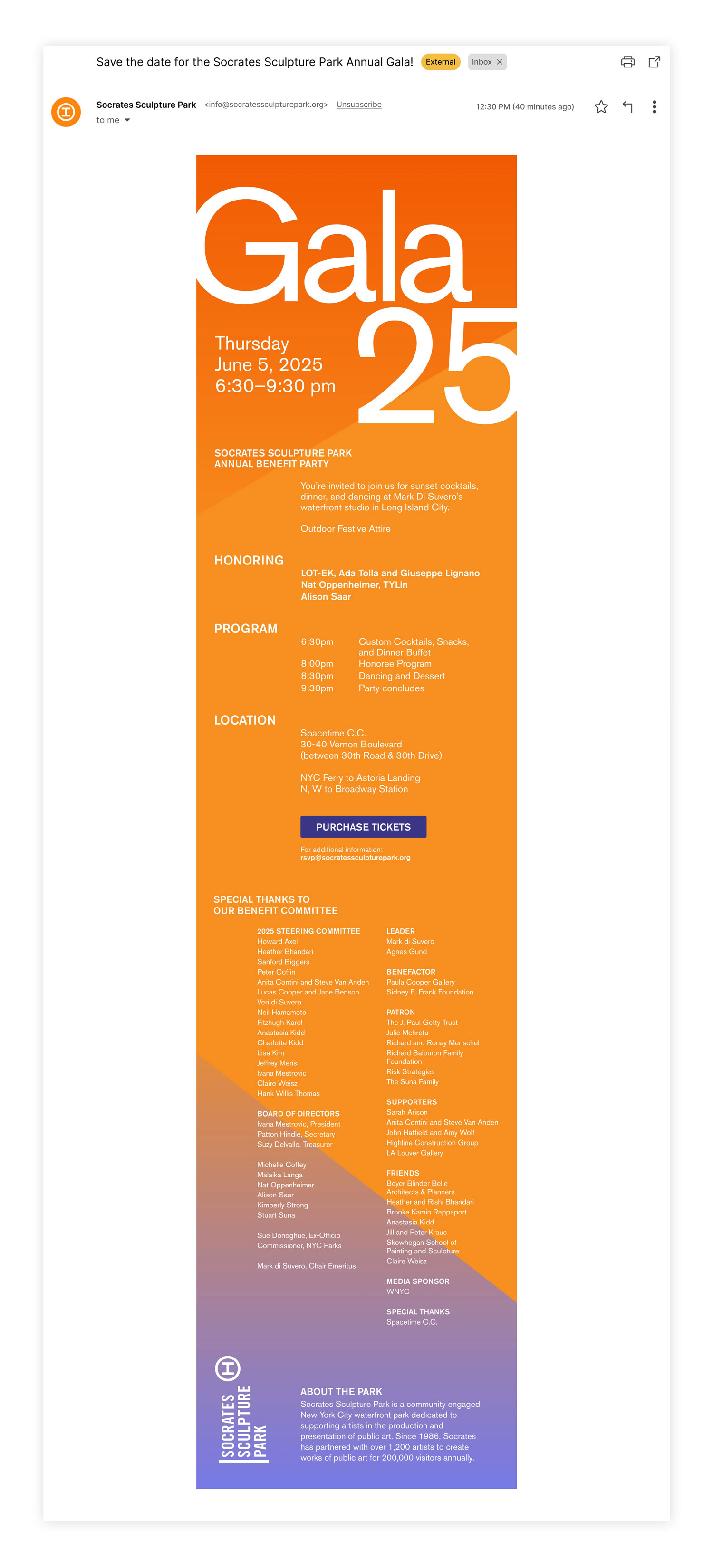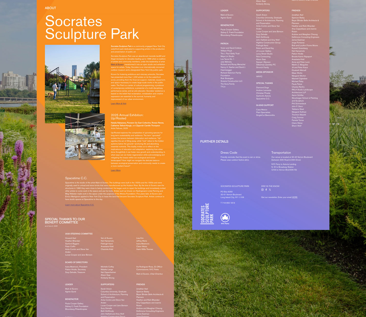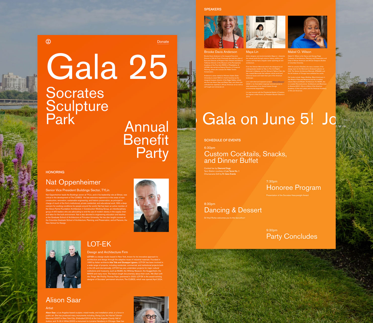 Each year, Socrates Sculpture Park brings together artists, funding partners, and supporters for an annual gala. The gala is not only a celebration of the park itself, but of the artist honorees and their work.